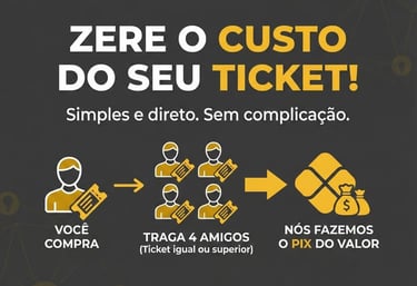 Ao adquirir seu ticket PRÓ (ou superior) e trazer +4 amigos que comprem o mesmo nível ou acima, o valor do seu convite retorna em PIX. Sem pontos que você não entende ou brindes que não quer: dinheiro na conta!